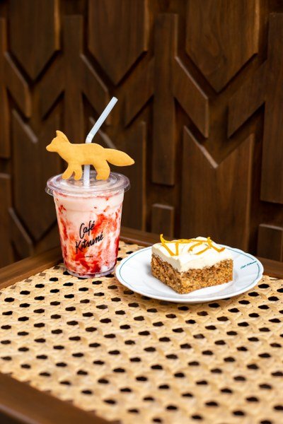 สำหรับเมนูขนมและเครื่องดื่มทางคาเฟ่ คิทสึเนะ (Café Kitsuné) ได้เลือกมานำเสนอให้กับลูกค้าคนพิเศษในช่วงเทศกาลนี้ประกอบไปด้วย 2 เมนูเครื่องดื่ม และ 2 เมนูขนม สำหรับเมนูแรกคือ สโมกกี้ ฟ็อกซ์ ที (SMOKY FOX TEA) เครื่องดื่มในกลุ่มชา ที่ให้สัมผัสรสชาติที่ซับซ้อนของเมนูที่มีกลิ่นหอมอันโดดเด่นจากชาคุณภาพดีทั้ง 2 ชนิด ไม่ว่าจะเป็นกลิ่นหอมรมควันของชาอู่หลง จากไร่ชาที่อำเภอแม่จัน จังหวัดเชียงราย ที่ถูกนำไปอบด้วยกรรมวิธีแบบดั้งเดิม โดยการนำชาไว้บนตะแกรงที่รมควันด้วยกลิ่นหอมจากไม้ลิ้นจี่ นานกว่า 24 ชั่วโมง จากนั้นจึงนำชามาพักในไหเซรามิกประมาณหนึ่งเดือน เพื่อให้ตัวชานั้นสามารถซึมซับกลิ่นรมควันจากถ่านไม้ลิ้นจี่ได้อย่างเต็มที่ ทำให้ตัวชานั้นมีรสชาติที่ดีขึ้นและเต็มไปด้วยความหอมของกลิ่นอบไฟ เพิ่มมิติด้วยกลิ่นคั่วอันเป็นเอกลักษณ์ของ โฮจิฉะ (Hojicha) ชาเขียวคุณภาพดีที่นำเข้าจากเมืองอูจิ (Uji) ประเทศญี่ปุ่น โดยตัวชาผ่านการนำไปคั่วที่อุณหภูมิสูงจนใบเปลี่ยนเป็นสีน้ำตาลเพื่อให้ใบชาส่งกลิ่นหอมและออกรสชาติที่เข้มข้นทำให้เมนูนี้มีความหอมละมุน และกลมกล่อมอย่างลงตัว