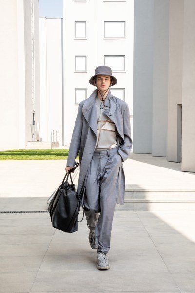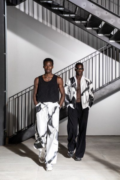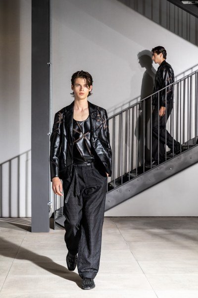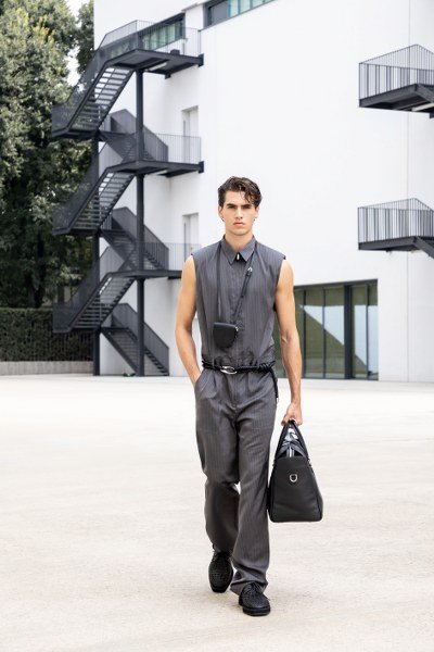 Emporio Armani สำหรับผู้ชายได้มีการปรับสัดส่วนโดยลดทอนลายเส้น เสื้อแจ๊คเก็ตถูกนำเสนอในดีไซน์ที่ยาวขึ้น ซึ่งมาพร้อมกับลูกเล่นเชือกคาดบริเวณอก หรือดีไซน์ไร้ปกเสื้อแบบคาร์ดิแกน ในขณะที่บางไอเทมจะมาพร้อมกับดีไซน์แบบคอตั้ง อีกทั้งยังปล่อยให้เนื้อผ้าได้ทิ้งตัวอย่างเป็นอิสระหากแต่ยังคงรูปทรงเอาไว้ Emporio Armani จับคู่เสื้อในแบบต่างๆ เข้ากับกางเกงขายาว และเสื้อกั๊กที่สวมโดยปราศจากเสื้อตัวใน เพื่อเพิ่มความโดดเด่น และเสริมให้ไอเทมนั้นพิเศษมากยิ่งขึ้น