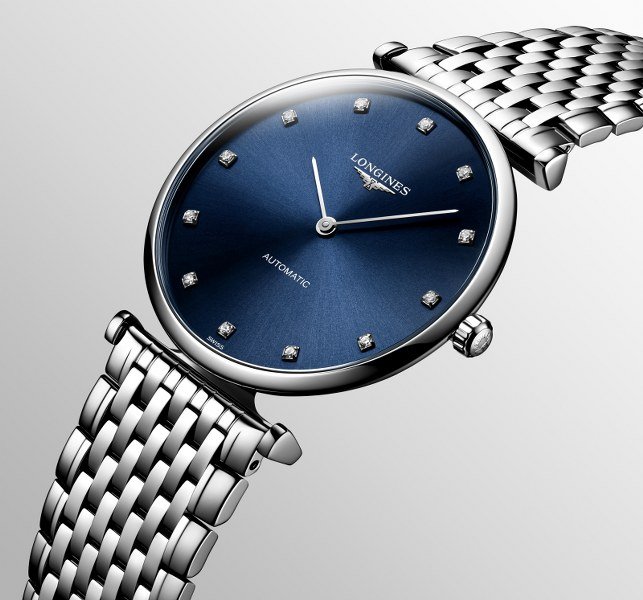 นาฬิกาคอลเลกชั่น La Grande Classique de Longines มีความโดดเด่นที่ตัวเรือนบางเฉียบซึ่งรังสรรค์ด้วยเทคนิคความเชี่ยวชาญโดยเฉพาะของแบรนด์ สามารถใส่ติดข้อมือได้ในทุกๆ วัน สำหรับสุภาพบุรุษแนะนำโมเดล L4.908.4.97.6 ทำงานด้วยกลไกควอทซ์ ตัวเรือนขนาด 36 มม. ตกแต่งอินเด็กซ์เพชร Top Wesselton VS-SI 12 เม็ด รวม 0.081 กะรัต หน้าปัดสีน้ำเงินซันเรย์ มาพร้อมสายรัดข้อมือสแตนเลสสตีล ส่วนของสุภาพสตรีแนะนำโมเดล L4.512.4.97.6 ทำงานด้วยกลไกควอทซ์ ตัวเรือนขนาด 29 มม. ตกแต่งอินเด็กซ์เพชร Top Wesselton VS-SI 12 เม็ด รวม 0.081กะรัต หน้าปัดสีน้ำเงินซันเรย์ มาพร้อมสายรัดข้อมือสแตนเลสสตีล