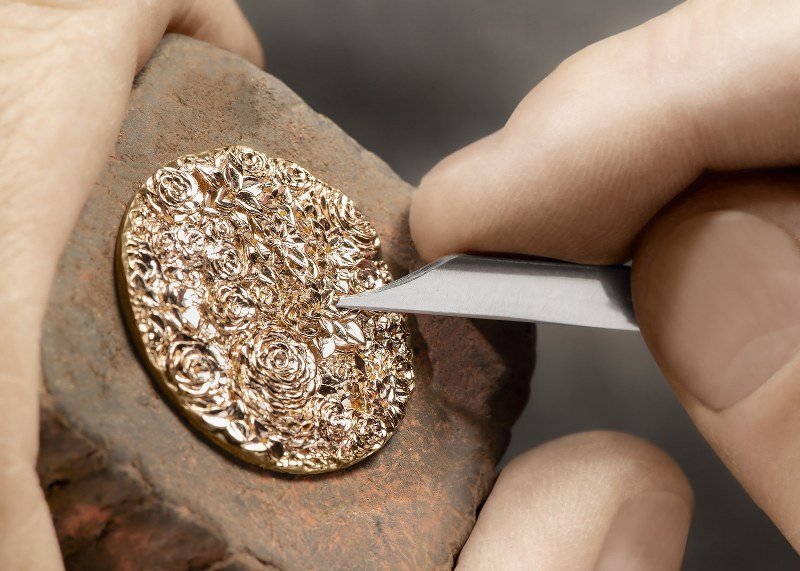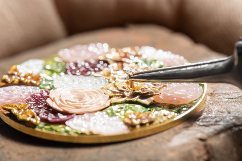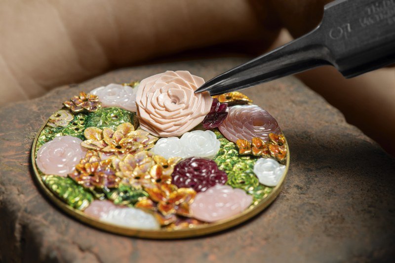 เริ่มต้นชิ้นงานด้วยฝีมือแกะสลักของ Dick Steenman ที่เนรมิตดอกกุหลาบขนาดจิ๋วให้บานสะพรั่งทั่วทั้งหน้าปัด ก่อนส่งต่อให้ Anita Porchet แต่งแต้มสีสันด้วยการเคลือบสีลงยา เมื่อผ่านการเผาจนได้เฉดสีที่ไร้ที่ติจึงส่งกลับให้ Dick Steenman อีกครั้ง เพื่อขัดแต่งรายละเอียดของกลีบดอก รวมถึงนำหินสีที่ผ่านการแกะสลักด้วยเทคนิค glyptic ที่หาตัวจับได้ยากมาประดับลงบนหน้าปัดอย่างประณีต แต่งแต้มให้สมจริงด้วยเกสรดอกไม้ที่ทำจากเพชร แซฟไฟร์ และ ซาวอไรต์