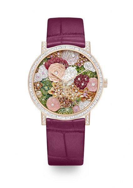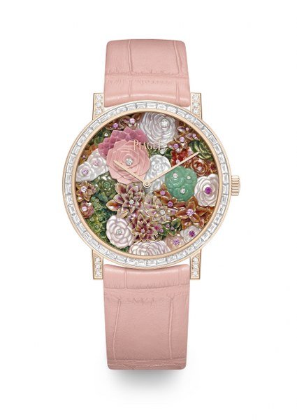 Altiplano – Rose Bouquet Métiers d’Art ตัวเรือนโรสโกลด์ ขนาด 36 มิลลิเมตร ขอบตัวเรือนประดับเพชรทรงบาแก็ตต์ หน้าปัดตกแต่งอย่างวิจิตรด้วยอัญมณีหลากสี ไม่ว่าจะเป็น แซฟไฟร์สีชมพู, ซาวอไรต์สีเขียว และเพชร ในแพทเทิร์นและเฉดสีที่ต่างกันออกไป มีให้เลือก 3 สไตล์;