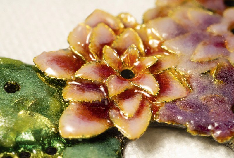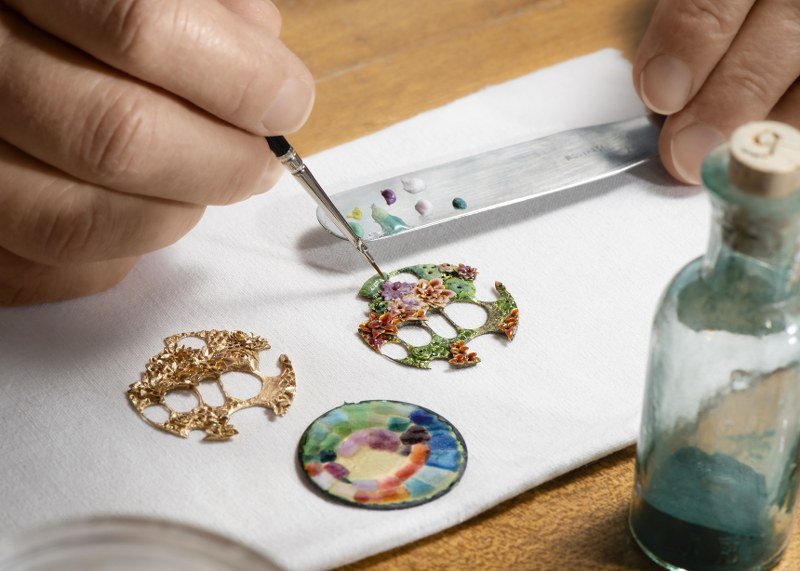 3. ในพาร์ทของการเคลือบสีลงยาก็ซับซ้อนพอกัน ไม่เพียงแต่การออกแบบโทนสีในแต่ละตำแหน่งเพื่อบอกเล่าเรื่องราวได้อย่างสมจริง แต่ Anita Porchet ต้องใส่ใจแม้กระทั่งความหนาของอีนาเมลเพื่อไม่ให้บดบังรูปแกะสลักอื่น ๆ ที่อยู่ข้างใต้ ขณะเดียวกันเพื่อให้นาฬิกาแต่ละรุ่นมีเอกลักษณ์ที่ควรจดจำ เธอยังได้สร้างสรรค์เฉดสีเฉพาะที่เข้ากับอัญมณีอีกด้วย รวมถึงประยุกต์ลูกเล่นต่าง ๆ ไม่ว่าจะเป็นการเล่นแสงเงาที่ทำให้กลีบดอกไม้ดูพลิ้วไหวราวกับมีชีวิต