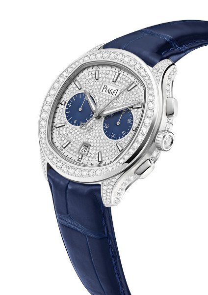 Piaget Polo Chronograph Adorned with Diamonds (G0A46049) สำหรับใครที่สนุกกับการสไตลิ่งไอเท็มแนววิบวับ Piaget Polo Chronograph ประดับเพชร คือคำตอบ ! โดยเรือนเวลาชิ้นนี้ถูกออกแบบในตัวเรือนไวท์โกลด์ ขนาด 42 มิลลิเมตร ดึงดูดสายตาด้วยประกายงามของเพชรที่ครอบคลุมทั่วทั้งหน้าปัดและตัวเรือนกว่า 480 เม็ด (ราว 3.96 กะรัต) จับคู่สายรัดข้อมือหนังจระเข้สีน้ำเงินกลิ่นอายสปอร์ต ที่ตอบโจทย์หนุ่มลุคเนี้ยบได้อย่างลงตัว