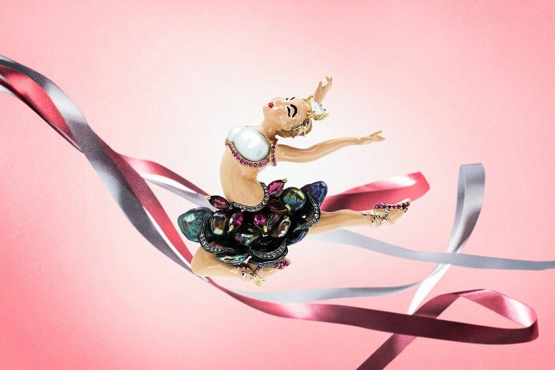 Enamel Ballet Dancer Brooch เข็มกลัดนักบัลเล่ย์ลงยา ตัวเข็มกลัดรูปนักบัลเล่ย์ที่กำลังเต้นรำประดับด้วยไข่มุก ถูกสร้างสรรค์ขึ้นอย่างประณีตด้วยมือทุกขั้นตอนเพื่อให้การจัดวางไข่มุกแต่ละชิ้นลงตัวอย่างสวยงาม นอกจากนี้ยังเพิ่มมิติแห่งความหรูหราขึ้นไปอีกขั้นด้วยไข่มุกเซาท์ซีบาร็อคเหลือง ประดับตกแต่งด้วยเกรย์คอนเฟลคเพิร์ล การลงยาอย่างพิถีพิถัน ผสมผสานกับทองคำ 9 กะรัต ตกแต่งรายละเอียดของเข็มกลัดให้เลอค่ายิ่งขึ้นด้วยเพชรน้ำงามเจียระไนแบบโรส-คัท ทับทิม และอัญมณีสีชมพู
