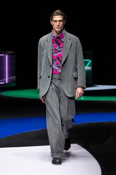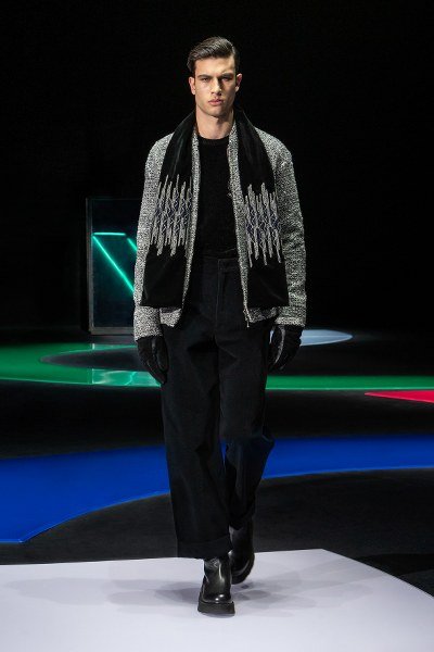 ในส่วนของเสื้อผ้าสำหรับผู้ชายนั้น ความอ่อนนุ่มได้ถูกตีความผ่านรูปทรงและฟังก์ชั่นในแบบใหม่ โครงร่างจะถูกเพิ่มความพลิ้วไหวและผ่อนคลาย เสื้อแจ๊คเก็ตจะมาพร้อมขนาดที่กว้างและไหล่ที่ลู่ลง เดินเส้นบริเวณขอบเสื้อด้านในด้วยขน เพื่อให้สามารถใช้แทนเสื้อโค้ทได้ ในขณะที่เสื้อโค้ทซึ่งถูกตัดเย็บหรือทออย่างประณีตด้วยผ้านิตจะช่วยให้รู้สึกสบายและอบอุ่นราวกับสวมชุดคลุมตัวยาว เพื่อความคล่องตัว ช่วงลำตัวของเสื้อจะถูกเพิ่มความเพรียวเพื่อให้ง่ายต่อการเคลื่อนไหว กางเกงที่ตัดเย็บจากผ้าเนื้อนุ่มจะถูกเพิ่มลูกเล่นด้วยการพับขาและเอวสูงที่เข้ารูปไปกับช่วงตัว นอกจากนี้ Emporio Armani ยังได้รับแรงบันดาลใจมาจากชุดนอนที่มากไปด้วยความหรูหรา ซึ่งก่อให้เกิดเสื้อเบลเซอร์ไร้ปก ที่เหมาะแก่การสวมเป็นเสื้อแจ็คเก็ตสำหรับออกงานในช่วงกลางคืน ซึ่งผสมผสานรวมไว้กับกลิ่นอายในแบบสปอร์ต เสื้อพูลโอเวอร์และแจ๊คเก็ตตัวหนาอย่าง anoraks ซึ่งตัดเย็บจากขนแกะหรือผ้าวูลลายเฮอร์ริงโบน เสื้อ blousons ที่ตัดเย็บจากผ้านิตและประดับด้วยผ้าขนแกะจะช่วยสร้างแพทเทิร์นสไตล์ทหารที่แตกต่างออกไปจากเดิม ในส่วนของเสื้อสูทนั้นจะถูกตัดเย็บอย่างประณีตด้วยเนื้อผ้าที่เคลือบให้ดูคล้ายกับเดนิม และสำหรับการออกงานในช่วงกลางคืน Emporio Armani ได้ใช้สีดำเป็นหลัก แลดูสุขุมหากแต่เปล่งประกายด้วยผิวสัมผัสของกำมะหยี่ รองเท้าประจำซีซั่นจะถูกประดับด้วยส้นรองเท้าแบบหนา ในขณะที่กระเป๋าจะมีขนาดที่กว้างหากแต่พับเก็บได้