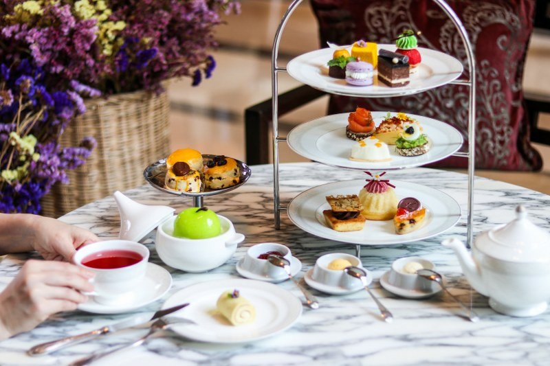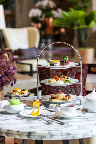 เริ่มต้นด้วยเมนูของว่าง อาทิ แซนวิชแฮมชีสสไตล์คลาสสิก มินิชีสเค้กแยมแอปริคอต ขนมปังพัมเพอร์นิกเคลท็อปด้วยไข่นกระทาและไข่ปลาคาเวียร์ คานาเป้ปลาแซลมอนแทสมาเนียนรมควัน และบริยอชขนมปังสไตล์ฝรั่งเศสเสิร์ฟกับกุ้งล็อบสเตอร์แคนาดา เมนูขนมหวานแสนอร่อยประกอบไปด้วย ชูครีมสตรอเบอรี่และถั่วพิสตาชิโอ บลูเบอร์รีมาการองสอดไส้ไวท์ช็อกโกแลตวิปครีม เค้กโอเปร่ากับครีมกาแฟเอสเพรสโซและช็อคโกแลตกานาช เค้กเสาวรสและสตรอว์เบอร์รีทรงมินิคิวบ์ เค้กชิฟฟ่อนนิ่มฟู กูเกลฮอฟ (Gugelhupf) สไตล์เยอรมันและอื่น ๆ อีกมากมาย พลาดไม่ได้ด้วยความอร่อยจากเมนูสโคนโฮมเมดสูตรพิเศษ ไม่ว่าจะเป็นสโคนสูตรต้นตำรับ สโคนลูกเกดและ สโคนช็อคโกแลตวาโรนา (Valrhona) รับประทานคู่กับแยมสตรอว์เบอร์รี เลมอนเคิร์ดและเดวอนเชียร์ (Devonshire) คลอตเต็ดครีม