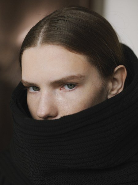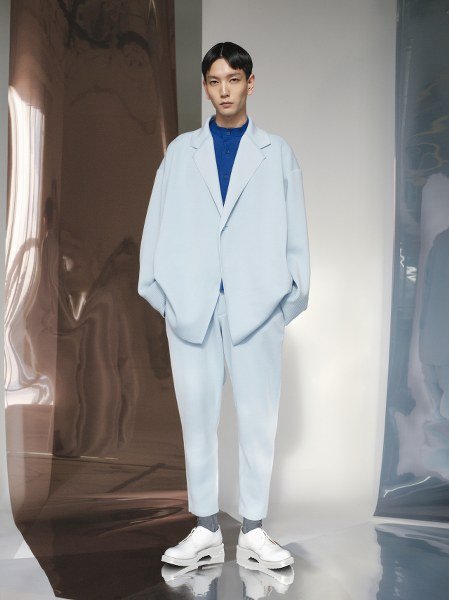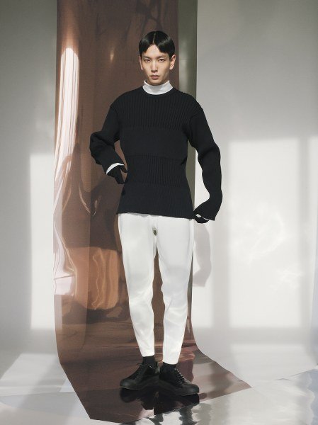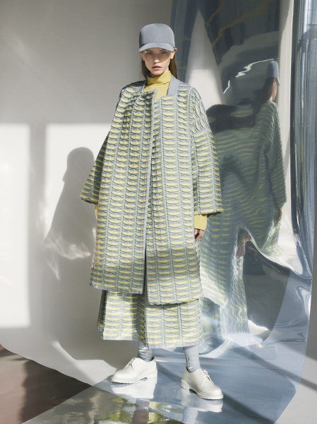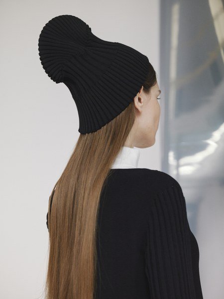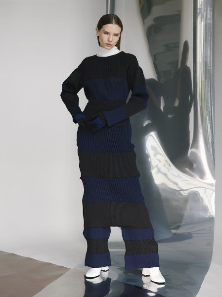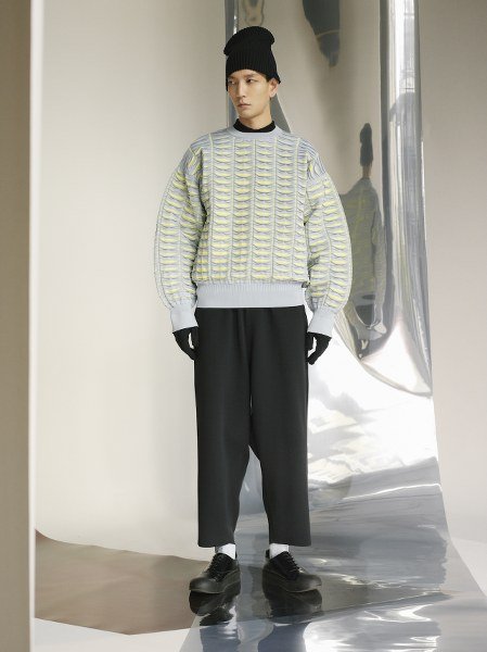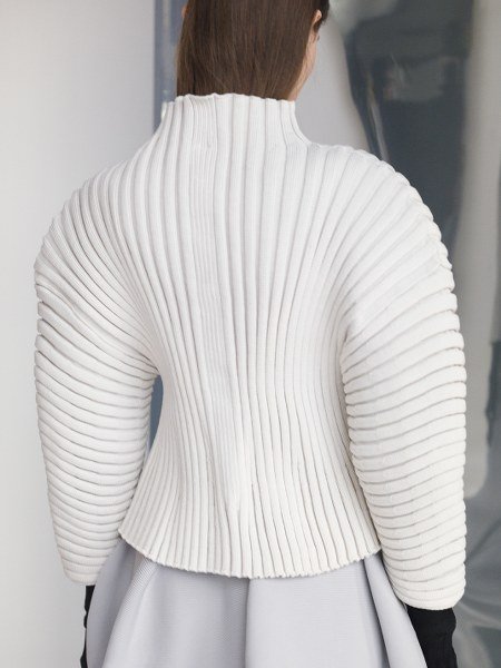 คำว่า Fluted ในทางสถาปัตยกรรมและการออกแบบนั้นหมายถึง “ร่องในแนวตั้ง” ในคอลเลกชันนี้มีริบหรือร่องเส้นนูนของการถักอยู่สองประเภท ริบทั้งสองมีอัตราการหดตัวของเส้นใยต่างกัน พอเวลานำมารวมกันจึงก่อให้เกิดโครงเสื้อผ้าที่ไม่เท่ากัน ตัวเสื้อกับช่วงแขนถูกถักโดยวิธี WHOLEGARMENT คือการถักแบบสามมิติไม่มีตะเข็บก่อนนำมาต่อเข้าด้วยกันทีละชิ้น