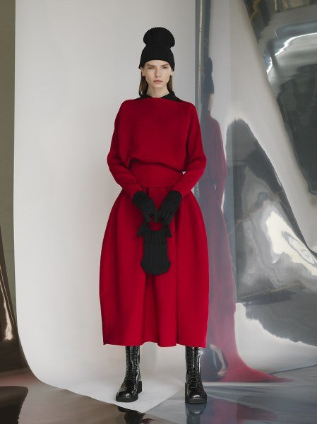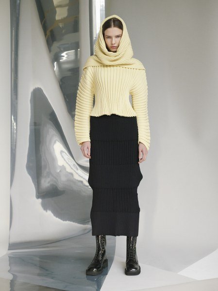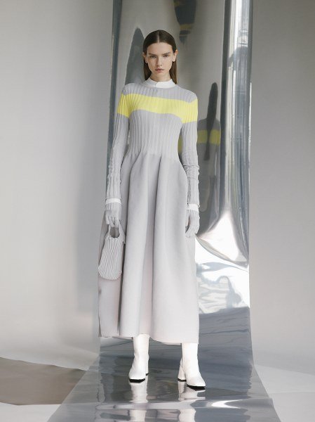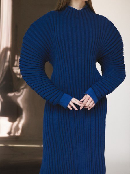 ด้วยแรงบันดาลใจจากเสาคอลัมน์ (column) ที่เป็นเอกลักษณ์ในสถาปัตยกรรมกรีก ชุดเดรสในคอลเลกชันนี้จึงถูกออกแบบมาพร้อมโครงร่างที่ดูหนาและแข็งแรง โดยใช้โครงสร้างการถักแบบ 7-gauge ที่ให้ความหนาในระดับกลาง มีการผสมกับโพลิเอสเตอร์บริสุทธิ์ที่มีลักษณะพองและโพลิเอสเตอร์รีไซเคิลเพื่อให้ได้เอฟเฟกต์ของโพลิเอสเตอร์รีไซเคิลเพื่อให้ได้เอฟเฟกต์ของผ้าที่ถักออกมาไม่เรียบ ชุดเดรสทรงดินสอมาพร้อมแขนเสื้อทรงโค้งที่ถักด้วยเส้นใย WHOLEGARMENT ซึ่งจะมาบรรจบกันพอดีตรงช่องแขนเสื้อ
