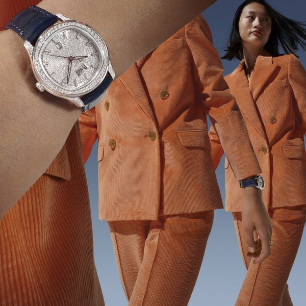 เอาใจผู้ที่ชื่นชอบไอเท็มแนวระยิบระยับกับ 2 เวอร์ชั่นสุดท้าย โดยไฮไลต์อยู่ที่ดีไซน์หน้าปัดที่ถูกเติมเต็มด้วยเพชรแบบ Fully-paved; จับคู่สายหนังจระเข้สีน้ำเงิน (G0A46024) และสายรัดข้อมือประดับเพชร (G0A46022)
