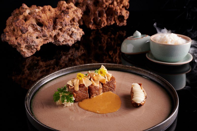 มาถึงคอร์สอาหารจานหลัก มัสมั่นซี่โครงเนื้อสันจากออสเตรเลียซูวี 48 ชั่วโมงที่ 62 องศาเสิร์ฟพร้อมแก่นตะวันทอดและปูว์เร พร้อมข้าวหอมมะลิโครงการหลวงจากท้องถิ่นจังหวัดสุรินทร์