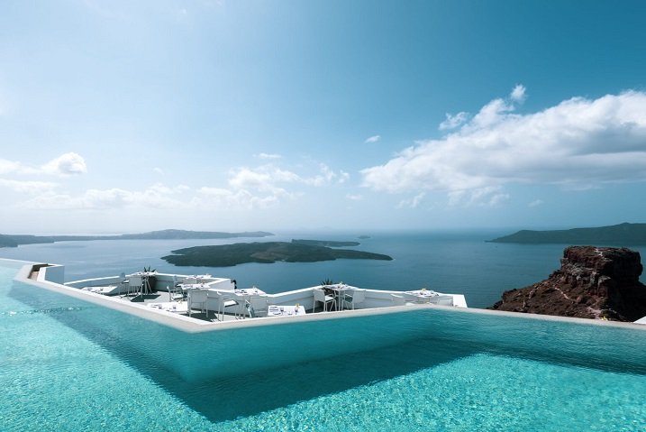 ซานโตรินี ประเทศกรีซ Grace Santorini Hotel โรงแรมบูติกสุดเอ็กซ์คลูซีฟแห่งนี้ตั้งอยู่สูงเหนือทะเลอีเจียน ทำให้มองเห็นทัศนียภาพของพื้นที่แอ่งภูเขาไฟอันสวยงามขึ้นชื่อได้อย่างไม่มีอะไรมาบดบัง สระว่ายน้ำของโรมแรมถือเป็นสระว่ายน้ำแบบอินฟินิตี้ที่ใหญ่ที่สุดในหมู่บ้านอิเมโรวิกลี (Imerovigli) ผู้เข้าพักสามารถเอนหลังดื่มค็อกเทล หรือกินอาหารไปชมวิวไปได้ที่บาร์ริมสระว่ายน้ำ และเพื่อเป็นการเติมเต็มประสบการณ์การพักผ่อนหย่อนใจ ทางโรงแรมยังมีคลาสโยคะตอนช่วงพระอาทิตย์ขึ้น และพระอาทิตย์ตกให้สำหรับสายโยคะ และกิจกรรมปิกนิกนั่งลิ้มรสชีส และอาหารกรีกสำเร็จรูปหลากหลายบนแหลมหินสการอส (Skaros Rock) อีกด้วย