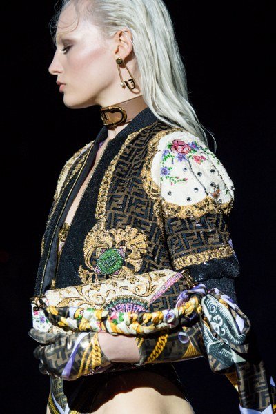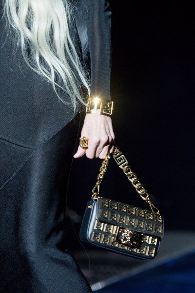 ในขณะที่ FENDI BY VERSACE นั้น นำเอาสไตล์พังก์ร็อคมาใช้ในการสร้างสรรค์คอลเลกชั่น ซึ่งโดนาเทลล่า เวอร์ซาเช่ ได้แรงบันดาลใจมาจากสถานการณ์โลกในปัจจุบัน โดยใช้เข็มกลัดเวอร์ซาเช่เจาะผ่านสัญลักษณ์อันเป็นเอกลักษณ์ของเฟนดิ ในขณะที่ผ้าทอโซ่อันเป็นเอกลักษณ์ของเวอร์ซาเช่ถูกนำมาผสมผสานกับลูกไม้และคริสตัลที่ทำเป็นลายโมโนแกรมตัว F ของเฟนดิ ส่วนผ้าแพรไหมถูกนำมาใช้เพื่อเลียนแบบผ้าเดนิมและขนแกะที่มีการตัดแต่งเพื่อแสดงถึงเอกลักษณ์ของเฟนดิในแบบที่ดูเด็กลงและดูขบถมากขึ้น