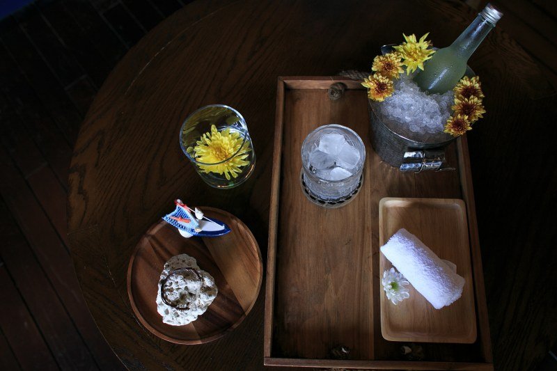 Welcome Drink เครื่องดื่มที่มีส่วนผสมจากน้ำตาลมะพร้าวสมุย และชเวปส์มะนาวโซดา เสิร์ฟใส่ขวดแช่เย็น พร้อมน้ำแข็ง อย่าง Where is Coconut ? มาพร้อมผ้าเย็น เพื่อคลายร้อน และกำไรซึ่งนำทรายจากหน้าหาดเชิงมนมาใส่ เป็นกิมมิกเก๋ๆ ของ Kimpton Kitalay Samui ที่นำมาต้อนรับแขกตอนเช็คอินน์